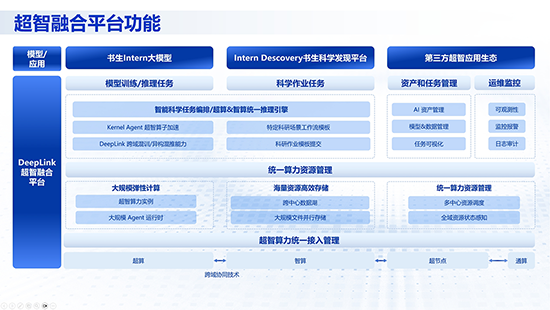 超智融合的本质并非简单的算力叠加,而是实现超级计算(超算)与智能计算(智算)的深度协同与一体化。以 DeepLink 平台为载体,一方面整合 HPC 与 AI 异构算力体系,实现跨集群、跨节点、跨架构的统一纳管与调度;另一方面推动 AI 大模型技术与科学计算、分子模拟、量子化学等场景的融合,构建 “超算支撑智算、智算赋能超算” 的双向协同模式,最终形成服务于科学智能(AGI4S)的一体化计算基础设施。